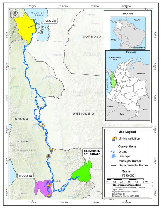 Map of the geographical location of the three municipalities influenced by the Atrato River basin (Chocó-Colombia): El Carmen Atrato, Río Quito, and Unguía.