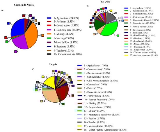 Occupation of the parents of the child population studied in the municipalities of (A) Carmen de Atrato, (B) Río Quito, and (C) Unguía.