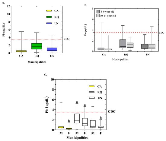 Regarding the concentrations of Pb in blood in the municipality of CA (n = 51), this region presented an average of 0.59 ± 0.85 μg/dL and a range from 0.3 to 5.47 μg/dL. For this study area, it was found that 2% (1) of the child population had blood Pb concentrations above the reference value (3.5 μg/dL) (Figure 3A). In RQ (n = 64), the highest concentrations of Pb in blood were observed with a median of 1.85 ± 1.20 μg/dL and a range between 0.13 and 5.20 μg/dL. At this site, 11% (7) of the children evaluated presented concentrations above the reference value established by the CDC. In the municipality of UN (n = 56), Pb concentrations in blood showed an average of 1.04 ± 1.0 μg/dL and a range from 0.3 to 4.6 μg/dL. In total, 5.35% (3) of the children had blood Pb concentrations above the maximum allowed value (Figure 3A).