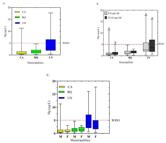 In the municipality of CA, boys (28) and girls (23) reported blood Hg concentrations between 0.16 and 11.28 μg/L and 27 and 3.04 μg/L, respectively. However, only 3.92% of the children presented concentrations above the reference value without significant differences (p > 0.05). In RQ, none of the concentrations in either gender exceeded the limits (0.20 to 4.69 μg/L and 0.51 to 2.95 μg/L, respectively). This finding is contrary to the results in the municipality of UN, where concentrations in boys and girls were between 0.66 and 16.03 μg/L and 0.37 and17.71 μg/L, respectively, with 23.21% and 10.71% exceeding the reference value, respectively (Figure 4C).