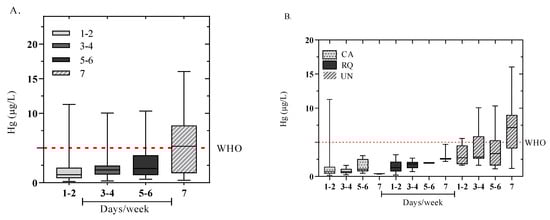 According to the results obtained in this investigation, the concentrations of Hg in the blood of the child population were analyzed taking into account the frequency of consumption (day/week) of fish (Figure 5A). The frequency of consumption was divided into the following ranges: 1–2, 3–4, 5–6, and 7 days/week. Overall, the children (n = 63) who consumed fish 1–2 days/week reported a range of concentrations from 0.16 to 11.28. The children who consumed fish 3–4 days/week reported a range between 0.24 and 10.05 μg/L (n = 56). Those who ate fish 5–6 days/week had values that ranged from 0.48 to 10.33 μg/L (13), and those who ate fish 7 times a week had values that ranged from 0.34 to 16.03 μg/L (n = 20).