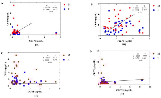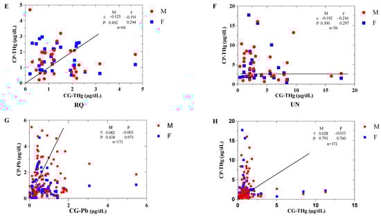 Pearson correlation analysis between (A) total concentrations of Pb in blood in the population (μg/dL) and total concentrations of Pb by gender (μg/L) in CA, (B) RQ, and (C) UN; (D) total concentrations of Hg in blood in the child population (μg/dL) and total concentrations of Hg by gender in CA, (E) RQ and (F) UN; (G) total concentrations of Pb in blood in the child population (μg/dL) and total concentrations of Pb by gender (μg/L) in the municipalities; (H) total concentrations of Hg in blood in the child population (μg/dL) and total concentrations of Hg by gender (μg/L) in the municipalities; (I) total concentrations of Hg in the population (μg/dL) and frequency of fish consumption (days/week). CP-Pb: total concentrations of Pb in the population (μg/dL); CG-Pb: total concentrations of Pb by gender (μg/dL); CP-THg: total concentrations of Hg in the population (μg/dL); CG-THg: total concentrations of Hg by gender (μg/dL); FCF: frequency of fish consumption (days/week).