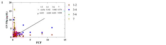 The Pearson correlation analysis between the total concentrations of Pb and Hg in the population based on gender and the frequency of fish consumption demonstrated few significant relationships. A low positive correlation was observed between total Hg concentrations in the population (CP) and fish consumption 3–4 days per week (r: 0.342; p < 0.009), and a moderate positive correlation was noted for the consumption of 7 days per week (r: 0.574; p < 0.008) (Figure 7I). Furthermore, there is a moderate positive correlation, albeit not significant, for the consumption of fish for 5–6 days (r: 0.482; p < 0.095). Likewise, there is a significant moderately low positive correlation between CP-Pb and CG-Pb for the female gender in RQ (r: 0.193; p < 0.037) (Figure 7B). The other correlations were moderately low positive or negative without statistical significance (Figure 7).
