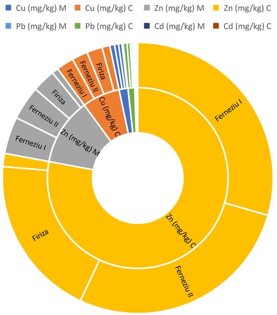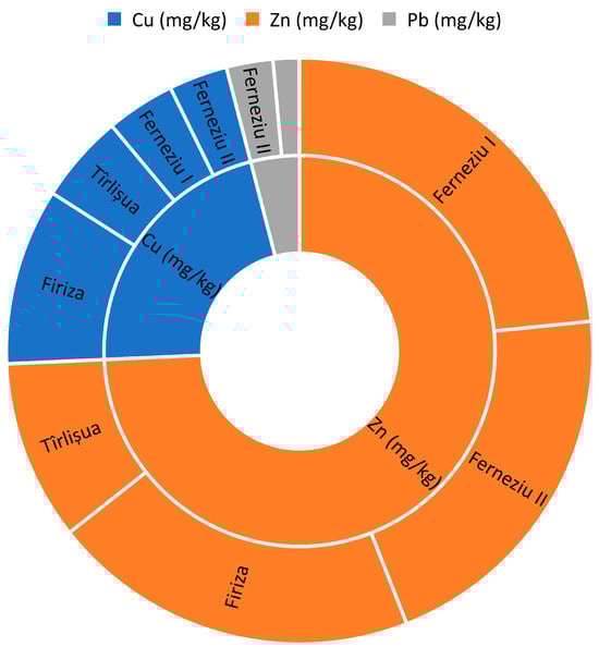 Copper (Cu) exhibited significant spatial variations in the soil samples (Figures S2 and S3), with concentrations ranging from a minimum of 0.89 mg/kg to a maximum of 2528.20 mg/kg (average value: 1072.35 mg/kg). The highest concentrations were observed in Ferneziu, located closest (6–7 km) to the former Herja mine, the identified source of pollution (322.82 mg/kg). Cu concentrations decreased with increasing distance (285.81 mg/kg at 10–12 km and 246.50 mg/kg at 16.5 km, furthest from the mine). Similarly, Firiza displayed elevated Cu (808.72 ± 134.94 mg/kg) compared to the control area (Tîrlișua: 0.89 ± 0.33 mg/kg). These findings suggest potential environmental risks associated with Cu contamination, particularly near the mine and in Firiza.
