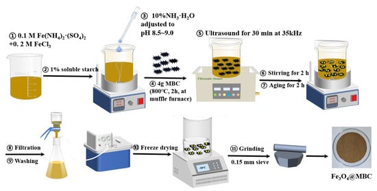MBC and Fe3O4@MBC were synthesized according to our previous research method [] as follows: 400 mL of a mixed solution of 0.1 M Fe2+ and 0.2 M Fe3+ (prepared on the spot) was added to a 1000 mL beaker followed by magnetic stirring at 240 rpm for 5 min; the mixed solution was titrated with 10% ammonia solution to pH 8.5–9.0 under magnetic agitation at 240 rpm; then 4 g of MBC (mulberry stem powder was placed in a muffle furnace and carbonized at 800 °C for 2 h at a heating rate of 5 °C·min−1) was merged into the mixed solution. The resulting mixture was performed ultrasonically at 35 kHz for 30 min, stirred magnetically at 70 °C for 2 h, and then aged for 4 h. Subsequently, the obtained product was cooled and filtered, washed with ultra-pure water to washing liquid pH around 7.0, and then washed twice with anhydrous ethanol and centrifuged. The resulting filter cake was freeze-dried at −50 °C for 48 to 72 h. In the end, these materials were ground to pass a 0.15 mm sieve and stored. The preparation process is illustrated in Figure 1.