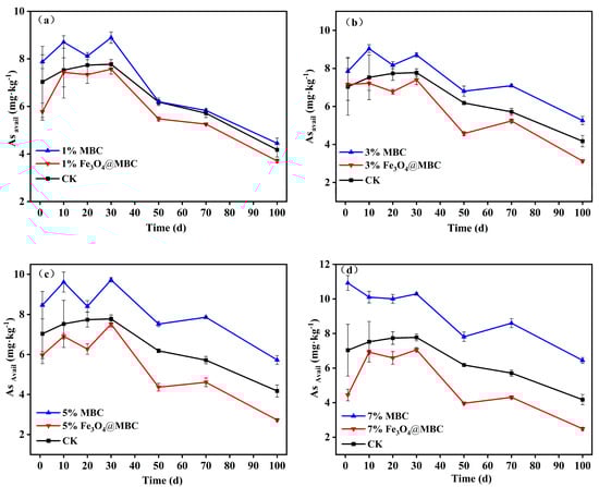 (a–d). The effects of soil Asavail content after adding 1%, 3%, 5%, 7% MBC and Fe3O4@MBC.