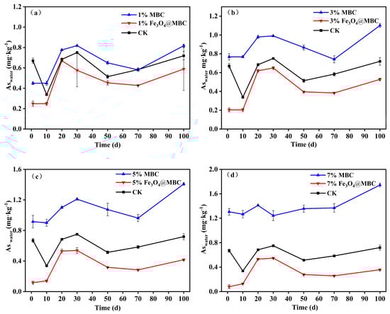 According to previous studies, the amount of Aswater and non-specifically bound As in contaminated soils correlates well with the amount of arsenic in plants, and most of this arsenic can be absorbed by plants []. AsO43− and AsO33− are the two primary forms of water-soluble arsenic (Aswater), which is typically found in soil solutions [,]. Therefore, Aswater is the primary assessment indicator of environmental risk. As shown in Figure 3, for the soil collected at different times, increasing the addition rate of Fe3O4@MBC significantly decreased the soil Aswater concentration compared with the control, which was attributed to the transformation to the residual fraction over time. However, MBC greatly increased the soil Aswater concentration for all treatments. In the doses of 1%, 3%, 5%, and 7% Fe3O4@MBC treatments, the Aswater’s immobilization efficiency was found to increase from 19.31% to 26.92% (Figure 3a), from 30.59% to 40.16% (Figure 3b), from 58.70% to 82.57% (Figure 3c), and from 62.30% to 88.59% (Figure 3d), in comparison with the control (1–10 d). Then, the concentration of Aswater kept the growth trend as the incubation days increase continuously (10–30 d). Eventually, it kept slight changes during the 50th through the 100th day of incubation time. This implied that the addition of Fe3O4@MBC played a positive role in As immobilization in the soil, and Fe minerals control the status of soil As whatever the various ratio treatments [,]. Consistent with our analysis above, a single MBC can activate As, so it is better to use it as a substrate or carrier to combine with iron oxides to achieve As passivation [,]. The cost of a single iron oxide material (CNY 4800 ha−1) is much higher than that of iron-based modified biochar materials (CNY 2336 ha−1) [,]. Overall, taking account of the economic benefits and environmental factors, it is necessary to modify MBC to stabilize As and other anionic metals in contaminated soils.