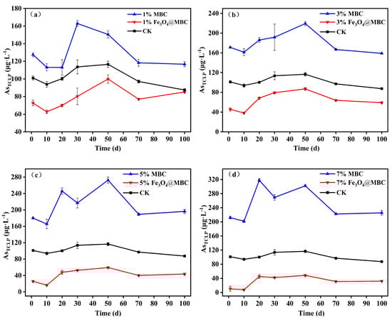 Usually, TCLP tests are used to evaluate the dissolution and mobility of As [,]. The TCLP extractable As concentrations indicated that the addition of Fe3O4@MBC at 1%, 3%, 5% and 7% had significant differences at incubation days 1 to 100 compared with those in the control group (p < 0.05), and it was dosage-dependent for As as the addition of Fe3O4@MBC (Figure 4). Specifically, the addition of the 7% Fe3O4@MBC treatment had a lower concentration of AsTCLP than that of the control; in addition, the concentration of AsTCLP was lowest at incubation day 10, which was lower than the international standards for drinking water quality (WHO) of 10 μg·L−1, while MBC addition elevated the AsTCLP concentration. The addition of 7% Fe3O4@MBC could effectively reduce the concentration of TCLPAs by 75% at incubation day 100 (Figure 4d). Interestingly, the addition of Fe3O4@MBC at 5% and 7% showed the same effect on the reduction in TCLP arsenic concentration. This can be explained by reaching adsorption saturation between a certain amount of material and soil available arsenic. Figure 4a shows that the soil aging time effect could slightly reduce the leaching risk of As (AsTCLP concentration in CK was lowest at incubation day 100). Biochar and oyster shell composites decreased soil AsTCLP concentration by 48.9% []. Based on the TCLP analysis, using Fe3O4@MBC to remediate As-contaminated soil was confirmed to be feasible. The results showed that Fe3O4@MBC was more effective than MBC in stabilizing As.