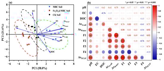 To better evaluate the influence of CK, MBC and Fe3O4@MBC treatment changes in soil parameters, a principal component analysis (PCA) was conducted []. The first and second principal components accounted for 58.0% and 21.6% of the total variables (Figure 5a), respectively, indicating that the presence of the soil passivator resulted in the difference. Specifically, pH, Asavail, Aswater, AsTCLP, F4, F2 and F1 were the elements that predominantly contributed to PC1. In contrast, PC2 was dominated by F3, DOC and EC, which were moderately correlated with PC2. These results illustrate that pH, DOC, and EC had moderate effects on As speciation (Asavail, Aswater, AsTCLP, F1, F2, F3 and F4). The locations of the passivator treatments varied and were grouped in the regions where treatments with similar effects on As speciation were grouped (Figure 5a). These were CK soil, MBC soil treatment and Fe3O4@MBC soil treatment. The overlapping section of the PCA indicates that the CK soil shares similarities with the MBC and Fe3O4@MBC soils in terms of collaborative treatment effectiveness (e.g., in EC and DOC). In conclusion, the efficacy of biochar treatment is dependent on the effective states of As in contaminated soil.