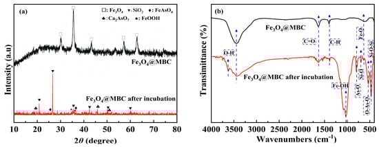 XRD and FTIR spectra of pristine Fe3O4@MBC and Fe3O4@MBC after 100 d of incubation: (a) XRD spectra and (b) FTIR spectra.