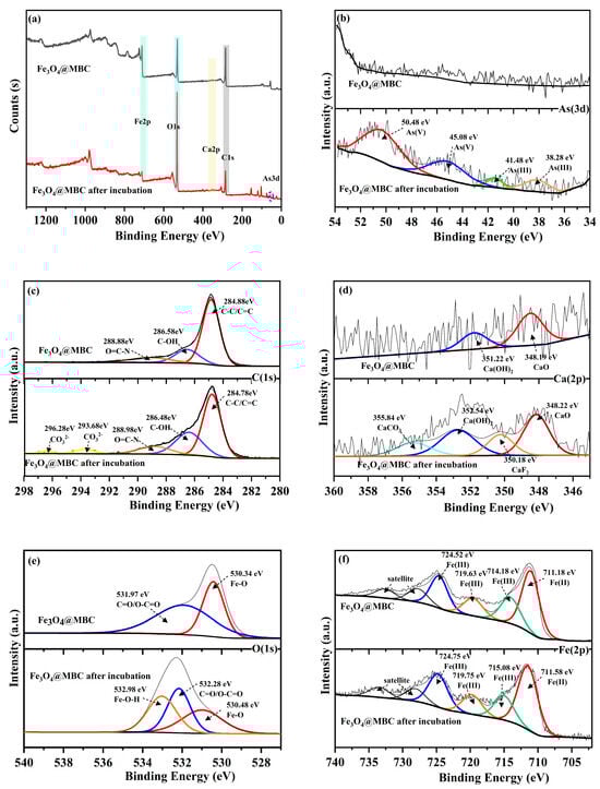 From the obtained XPS wide-scan spectrum, it can be observed that C, O, Fe, Ca exist in Fe3O4@MBC before and after incubation, and the photoelectron peak of As 3d appears, which is attributed to the immobilization of As onto the Fe3O4@MBC surface (Figure 7a). The As 3d region was deconvoluted into four different peaks, where As(V)-O corresponds to 50.48 eV and 45.08 eV, and As(III) corresponds to 41.48 eV and 38.28 eV (Figure 7b). The peak positions in the C 1s spectrum before and after incubation were changed insignificantly, and the peaks at 284.88 eV, 286.58 eV and 288.88 eV were correlated with C-H, C-OH, and O=C-N [], respectively (Figure 7c). The C=C/C-C groups decreased remarkably after incubation, whereas the oxygen-containing functional groups of C-OH and O=C-N increased. The lone-pair electrons in the oxygen-containing functional groups can combine with the empty arsenic orbitals to undergo coordination and complexation reactions [,]. Therefore, the increase in surface oxygen-containing functional groups was favorable for the immobilization of toxic trace elements [], in accordance with the FTIR analysis. Meanwhile, in the O 1s spectrum, the C=O/O-C=O peak shifted to a lower binding energy, and the peak ratio of the metal oxides (Fe-O and Fe-OH) increased after the reaction (Figure 7e). This change occurs because while Fe-O participates in As oxidation, Fe-O adsorbs As through complexation and carboxyl groups can also participate in the complexation of As []. There were two characteristic peaks of Ca (348.19, 351.22 eV) before incubation, which intensively increased after incubation, indicating that ion exchange occurred during incubation (Figure 7d). Owing to the abundant calcium content in the soil, two new peaks appeared for the recycled Fe3O4@MBC (350.18 eV and 355.84 eV) []. For Fe, the binding energy position of the Fe 2p spectrum did not change significantly before and after incubation; Fe(III) (Fe 2p peaks at 724.75 eV) was dominant, and the content of Fe(II) (Fe 2p peaks at 711.58 eV) in Fe3O4@MBC decreased after incubation, indicating that Fe(II) was partially oxidized into Fe(III) in the incubation process (Figure 7f).