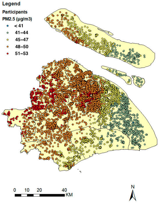 Distribution map of participants’ residential locations and long-term PM2.5 concentrations (2013–2017).