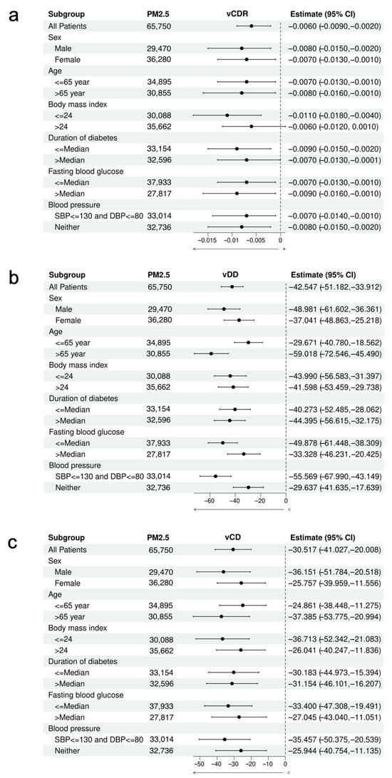 Subgroup analysis of the association between PM2.5 and optic disc parameters. The estimates represent the regression coefficient of a 10 μg/m3 increase in PM2.5 on (a) vCDR, (b) vDD, and (c) vCD. They were calculated for each subgroup using linear regression adjusting for gender, age, gender, body mass index, duration of diabetes, fasting blood glucose, and blood pressure. vCDR, vertical cup-to-disc ratio; vDD, vertical disc diameter; vCD, vertical cup diameter; CI: confidence interval.