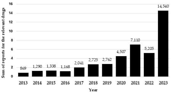 From the 21 drugs that were included in this study, there were a total of 198,640 adverse events reported to the FDA up until 31 December 2023. Among these, 38,756 (20%) adverse events related to the selected PTs were reported for the same 21 drugs. There was a total of 9566 (25%) deaths associated with the PTs for all drugs included in this study. Figure 1 demonstrates the general increase in the number of reports received by the FDA for the last 10 years for the associated drugs. Carprofen and tilmicosin were excluded from this total as they have received no relevant reports in the last decade.