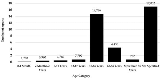 In the UK for the last 25 years, the age group with the highest rate of drug misuse deaths were those aged 40–49 []. As expected, the age group with the highest number of reports associated with the selected PTs were 18–64 years, contributing 14,766 (68%) of reports. Worryingly, 1772 reports were from children under 18 (8%), with 893 (4%) reports from those aged 0–11 years. It is unknown how these children gained these drugs and whether exposure was accidental or intentional. Various physiological differences between children and adults lead to significant variations in pharmacokinetics and pharmacodynamics, including gastric pH, first-pass metabolism, renal clearance, protein binding, protein concentration, and enzyme activities []. In 2023, the Office of National Statistics (ONS) reported 2734 drug poisonings from the years 1993–2022 for those aged under 20, with 1562 (57%) of these reports being classified as drug misuse [].