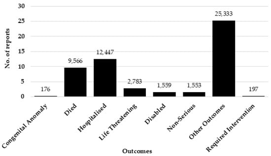 Examining the eight drugs exclusively approved for animal use, there is a noticeable overall increase in the number of reports for levamisole, pentobarbital, and xylazine. Carfentanil’s reports to the FAERS peaked in 2021 (41 reports) and slightly decreased in 2022 (19), with only 3 reports in 2023. Acepromazine had the highest number of reports in 2017 (33), yet reports have remained low since then. Phenylbutazone has received just seven reports since 2017, with only one report in 2023. Of the 21 drugs analysed, 12/21 (57%) demonstrated a higher number of reports from males, whereas 9/21 (43%) exhibited a greater number of reports from females. Although more drugs had males as the more common reporter, the total number of reports for all 21 drugs was higher for females. Females contributed to a total of 16,076 (50%) reports, whereas males reported 15,927 (50%) altogether. From the total number of reports, the ‘not specified’ age group accounted for 17,002 reports. Excluding the cases where the age was not classified, there were a total of 21,755 reports that were separated by age group. Of these, the age group 18–64 years accounted for 14,766 (68%) reports. Figure 2 illustrates the distribution of reports across specified age groups. The 18–64 age group had the highest number of reports for 20 out of 21 drugs, with furosemide having the highest number of reports in the 65–84 age category. Healthcare professionals submitted 20,431 (53%) total reports, while consumer reports accounted for 16,804 reports (44%). The reporter type for the remaining 1512 (4%) reports was unspecified. After excluding reports categorised as an ‘unknown outcome’, hospitalisation emerged as the most common outcome with 12,447 reports (44%), followed by death as the secondary outcome with 9566 reports (34%). Non-serious outcomes represented only 5% (1553) of reports.