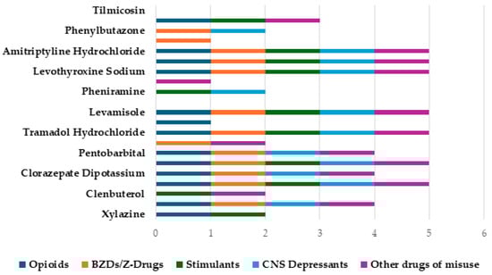 A systematic literature review (SLR) exploring the confluence of animal medicine and its implications for human health was conducted by the research group to investigate which specific veterinary medications are currently being misused by humans []. The review searched academic databases such as PubMed, Scopus, and Web of Science, using keywords such as “veterinary drug” OR “veterinary medication” OR “veterinary prescription drug” AND “misuse” OR “abuse”. Inclusion criteria focused on studies that provided evidence of veterinary drug misuse or diversion to human use. Results from this study found 28 distinct veterinary products, 15 that are exclusively for animal use and the remaining 13 approved for use in both humans and animals. Drugs licenced and approved for animal use only that were found to be misused by humans included xylazine, medetomidine, Telazol, carfentanil, pentobarbital, acepromazine, levamisole, tilmicosin, embutramide/mebezonium, dinoprost, cloprostenol, phenylbutazone, flunixin, carprofen, and the vitamin ADE compound. Drugs approved for use in animals and humans included dexmedetomidine, clenbuterol, ketamine, tramadol, butorphanol, diazepam, clorazepate, phenobarbital, pheniramine, stanozolol, levothyroxine, furosemide, and amitriptyline. These drugs, while intended for legitimate medical purposes, can be diverted for human misuse or utilised in veterinary-grade doses. Commonly misused drugs like diazepam were identified through the SLR but were excluded from the study due to a lack of evidence for veterinary-grade diazepam misuse or diversion through veterinary clinics for human misuse.