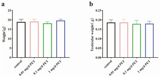 As shown in Figure 1, there was no significant difference in weight change in terms of body weight (Figure 1a) and the testicular weight (Figure 1b) after six weeks of exposure to PET MPs.