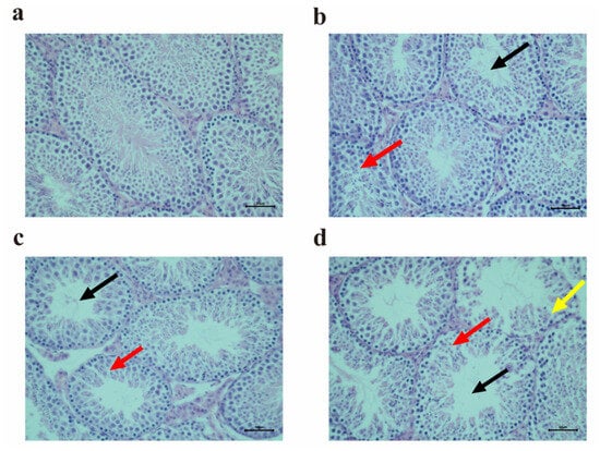 The pathological changes in testicular tissues determined via HE staining after PET MP exposure. (a) Control group; (b) 0.01 mg/d PET MP group; (c) 0.1 mg/d PET MP group; and (d) 1 mg/d PET MP group. The black arrow indicates that the spermatogenic tubule was empty. The red arrow indicates the disorder of the spermatogenic epithelium. The yellow arrow indicates the decrease in spermatogenic cells. Scale bar: 50 µm. n = 5 for all groups.