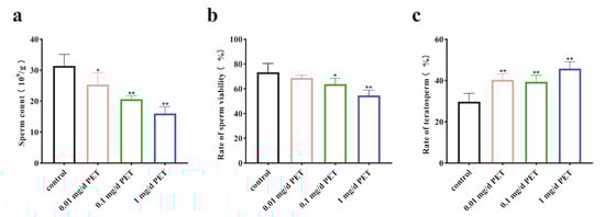 To further evaluate the reproductive capacity after PET MP exposure, the number of sperm, the rate of sperm survival, and the rate of sperm malformation were all determined. The results showed that the sperm counts in the different PET MP treatment groups significantly decreased in comparison to those in the control group, especially those in the medium- and high-dose groups (p < 0.01, Figure 3a). The sperm survival rate significantly decreased in the medium- and high-dose groups (p < 0.05, Figure 3b). In addition, the sperm deformity rate was significantly increased in all exposed groups (p < 0.01, Figure 3c).