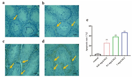 Apoptosis is a basic phenomenon of life, and it maintains the dynamic balance of the number of cells in the body. However, an increase in spermatogenic cell apoptosis can cause damaging reproductive health effects. As shown in Figure 4, the effects of spermatogenic cell apoptosis induced by PET MPs were observed using TUNEL staining. The brown area of apoptotic spermatogenic cells in Figure 4b–d expanded compared with the blue area of normal cells in the control group (Figure 4a). Moreover, the apoptosis rate of spermatogenic cells was significantly increased in a dose-dependent manner (p < 0.01, Figure 4e).