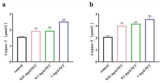 The expression levels of Caspase-3 and Caspase-9 after PET MP exposure. (a) The levels of Caspase-3; (b) the levels of Caspase-9. n = 5 for all groups. Data are presented as the mean ± SEM. ** indicates p < 0.01 (compared with the control group).