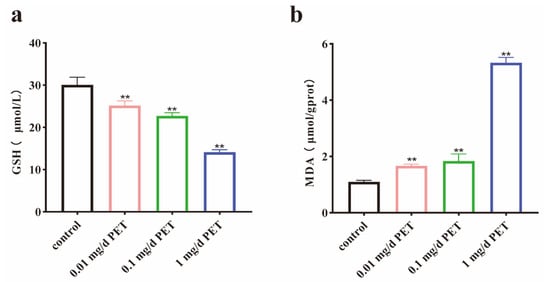 As shown in Figure 6a,b, the GSH and MDA levels in the testicular tissues of the mice were detected after PET MP exposure. It was found that the GSH levels significantly decreased (p < 0.01) and the MDA levels significantly increased (p < 0.01), suggesting that the oxidative damage mechanism might play a role in the male reproductive health damage effects of PET MPs.