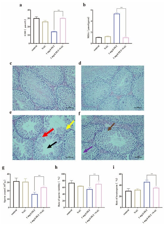 The pathological changes in the testicular tissue of mice after NAC antagonism. (a) GSH levels; (b) MDA levels; (c) control group; (d) NAC-treated group; (e) 1 mg/d PET MP group; (f) NAC intervention group; (g) sperm count levels; (h) sperm viability rate; and (i) teratosperm rate. The black arrow indicates that the spermatogenic tubule was empty. The red arrow indicates a disorder of the spermatogenic epithelium. The yellow arrow indicates a decrease in spermatogenic cells. The purple arrow indicates that the spermatogenic tubules are partially restored. The brown arrow indicates that the spermatogenic cells gradually recovered. Scale bar: 50 µm. n = 5 for all groups. Data are presented as the mean ± SEM. ** indicates p < 0.01 (compared with the control group).