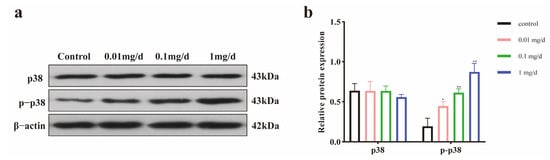 The p38 signaling pathway can mediate apoptosis by reducing the activity of anti-apoptotic genes [], in which the relative expression of p-p38 can reflect the activation state of the p38 signaling pathway. The p-p38 protein quantification of testicular tissue was performed using the Western blot method. The p38 antibody (AF4001; 1:1000 dilution), p-p38 antibody (AF3455; 1:1000 dilution), and β-actin (AF7018; 1:1000 dilution) were purchased from Affinity (Santa Barbara, CA, USA). The samples were electrophoresed in an SDS-PAGE gel and were transferred to a PVDF membrane (Millipore, MA, USA). This was followed by closure using 5% skimmed milk powder. After washing, the membrane was incubated with the corresponding primary antibody at 4 °C overnight. After incubation, the membrane was rinsed 3 times, and the washed primary antibody was put into the secondary antibody working solution to undergo a reaction. After the membrane was rinsed 3 times, it was placed into an exposure cassette and was developed using the gel imaging system. Finally, Image J 1.8.0 software was used to analyze the grayscale.