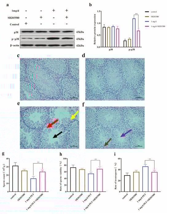 The pathological changes in testicular tissue after SB203580 blockade. (a) The expression of p38 and p-p38 in testis; (b) the quantification of p38 and p-p38 protein levels. β-actin was considered as the loading control. (c) Control group; (d) SB203580-treated group; (e) 1 mg/d PET MP group; (f) SB203580 intervention group; (g) the levels of sperm count; (h) the rate of sperm viability; and (i) the rate of teratosperm. The black arrow indicates that the spermatogenic tubule is empty. The red arrow indicates a disorder of the spermatogenic epithelium. The yellow arrow indicates a decrease in spermatogenic cells. The purple arrow indicates that the spermatogenic tubules are partially restored. The brown arrow indicates that the spermatogenic cells gradually recovered. Scale bar: 50 µm. n = 5 for all groups. Data are presented as the mean ± SEM. ** indicates p < 0.01 (compared with the corresponding intervention group).