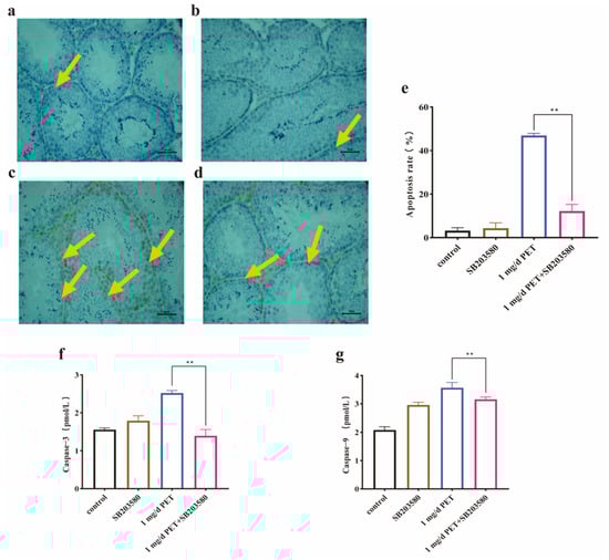 In addition, the results also showed that cell apoptosis was reversed. As shown in Figure 10a,b, cell apoptosis was very rare in the control and SB203580-treated groups. The brown area of apoptotic spermatogenic cells in the SB203580 intervention group (Figure 10d) was significantly less than that in the PET MP-exposed group (Figure 10c). Moreover, the apoptosis rate (Figure 10e) and the levels of the two apoptotic factors (Figure 10f,g) were significantly reduced (p < 0.01). Therefore, these findings demonstrated that the activation of the p38 signaling pathway could play an important role in the PET MP exposure-induced reproductive injury of male mice.