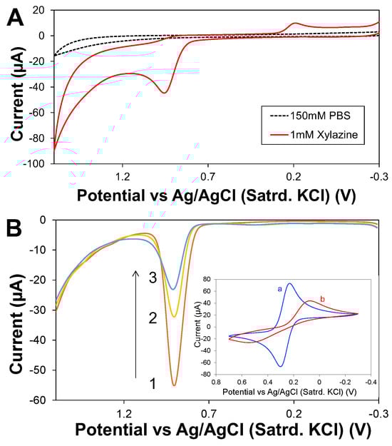 (A) Cyclic voltammetry (CV) of 1 mM XYL (solid trace) and corresponding background (dashed trace) of PBS without XYL (150 mM at pH = 7; 100 mV/s); (B) first three consecutive DPV oxidation scans of bare GCE in 1 mM XYL in PBS (150 mM PBS at pH = 7); Inset: CV of 5 mM potassium ferricyanide in 0.5 KCl at unmodified GCE (a) before and (b) after XYL exposure under applied oxidative potentials (100 mV/s).