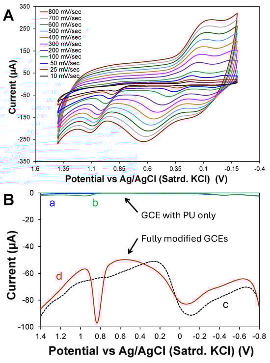 (A) CV of 2.5 mM XYL in PBS (150 mM; pH = 7) collected at various scan rates (inset) at the modified electrode system showing three major peaks including the primary XYL oxidation peak at +0.9 V, subsequent reduction of that product (+0.25V), and a second oxidation peak (+0.35) attributed to the MWCNTs; (B) DPV oxidative scans at GCEs modified with PU only (top scans) and fully modified GCEs (bottom scans) in PBS without XYL (a,c) vs. in 1 mM XYL solutions (b,d).