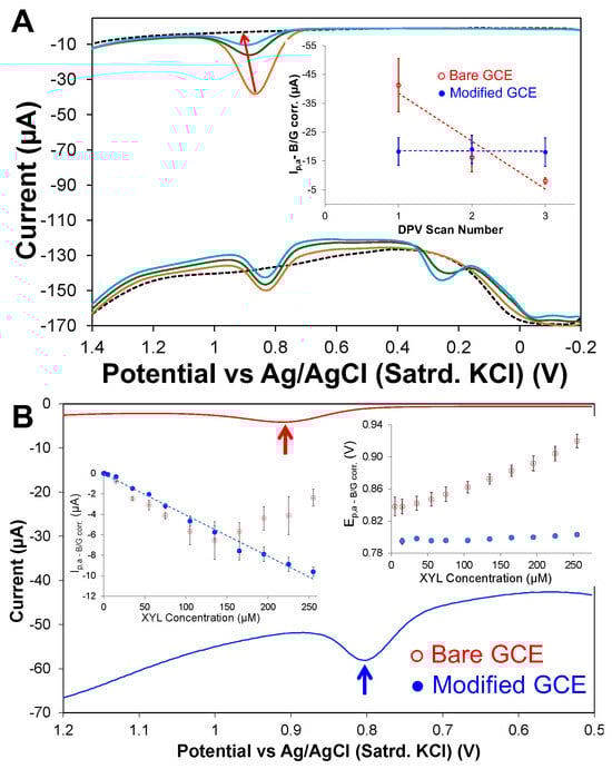 As previously mentioned, the requirement of frequent cleaning/polishing of an electrode can limit the overall utility of a sensing scheme []. When DPV scans are repeated at a bare electrode versus the modified electrode developed in this study, the fouling-resistant nature of the system is evident. As seen in Figure 4, at the bare GCE, peak current of XYL oxidation is drastically attenuated with each scan as the fouling passivates the electrode. While not as obvious during these initial scans, the peak potential (Ep,a) of XYL at the bare electrode is also observed to shift toward more positive potentials. Alternatively, the modified electrode maintains a well-defined peak, minimally diminished current (Figure 4A, inset), and a significantly more stable Ep,a from XYL oxidation over the same timeframe. The strength of the fouling-resistance of the modified electrode is most significant when DPV results over longer times and at higher XYL concentrations. Figure 4B displays DPV of XYL at both a bare GCE and the modified electrode after exposure to numerous scans at increasing XYL concentration. In this comparison, one can discern the difference in performance as the XYL peak has undergone a significant potential shift and peak broadening with diminished size/current. Tracking both the anodic peak current (Ip,a) and Ep,a for both electrode systems during XYL exposure (Figure 4B, insets) shows the modified electrode is able to maintain a linear relationship with current as a function of XYL concentration and minimal shift in Ep,a. In contrast, the bare GCE exhibits a shift in potential at low XYL concentration exposure and, while the current is linear with concentration at low concentrations, it eventually begins to diminish after exposure to ~120 µM XYL. Additional examples of this fouling-resistant behavior are provided in the Supplemental Data (Figure S6).