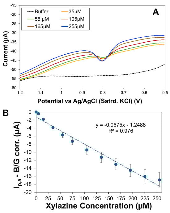 (A) Typical DPV scans collected with a modified GCE in increasing concentrations of XYL standard (50 mM) versus PBS background (dashed); (B) Representative standard calibration curve plotting background-corrected signal vs. XYL concentration. Note: For clarity, not all DPV scans at every XYL concentration are displayed in (A). Additional XYL calibration curve results are in the Supplemental Data.