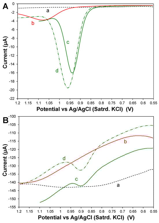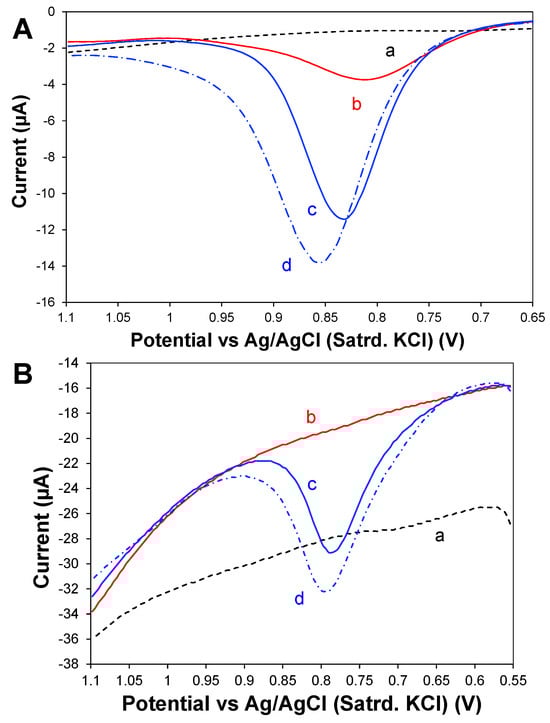 DPV scans of (A) bare and (B) fully modified GCEs in (a) 150 mM buffer (dashed trace), (b) 165 µM cocaine, (c) a mixture of 165 µM cocaine with 165 µM XYL and (d) that same mixture spiked with an additional 165 µM XYL spike or 330 μM XYL total concentration (dashed-dot trace).