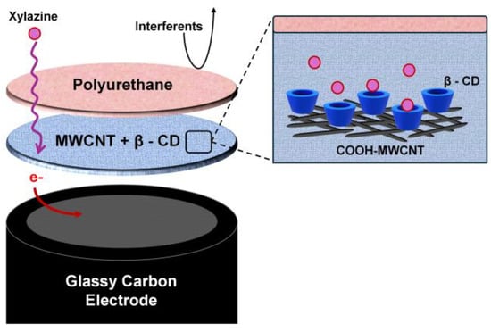 Depiction of layer-by-layer modification of GCE for XLY detection using COOH-MWCNT for sensitivity as well as β-CD molecules for host-guest chemistry and a polyurethane (PU) layer for selectivity.