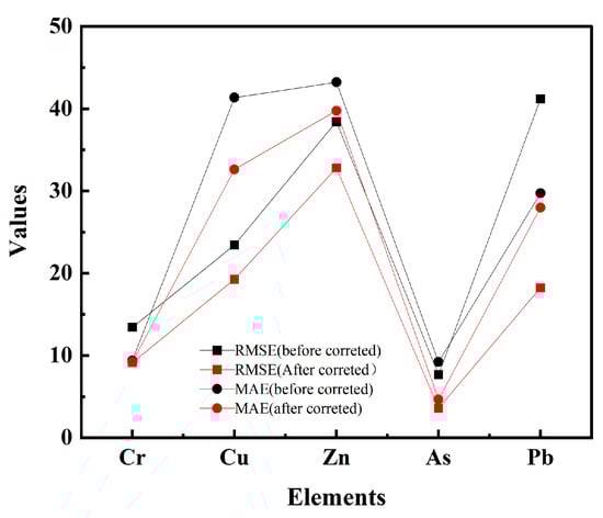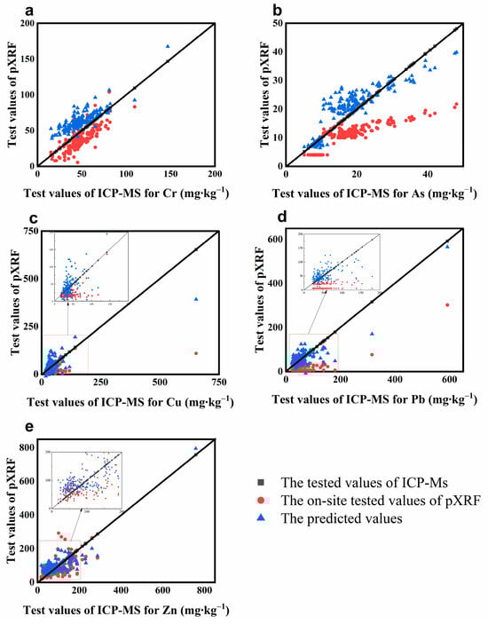 - The on-site test data obtained by pXRF can be considered as a reliable dataset after processing by the correction model. The order of correction for each element under this simple correction model is as follows: Cu > Pb > Cr > Zn > As. This exploratory correction method can be extended to the correction of other elements, which also provides a valuable reference for the correction of in situ measurements of other potential soil pollutants.
