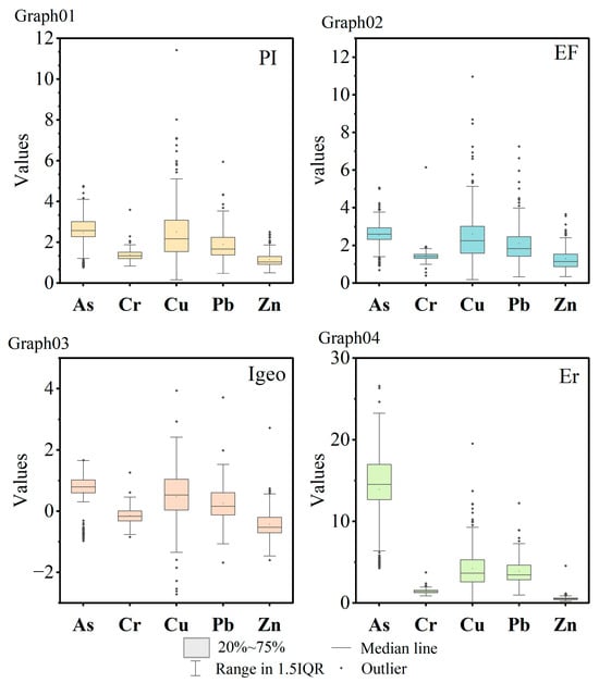 | Risk factor (RI) | n—the number of heavy metals, Tr—the toxicity response coefficient of an individual metal, Cf—contamination factor, Er—single index of the ecological risk factor [53]. | |