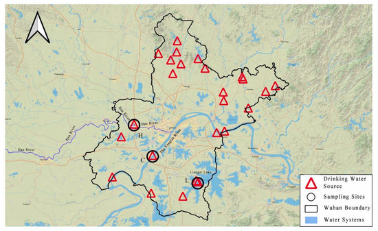Liangzi Lake is the largest freshwater lake in Wuhan City. The Han River and Yangtze River are the two largest rivers flowing through Wuhan City. Therefore, the reason why we choose these three water sources is that these three rivers are closely related to the drinking water safety of Wuhan’s people. To investigate the impact of water quality characteristics and sampling methods on the formation of DBPs from different water sources, water samples were collected from the Zongguan site of the Han River, the Junshan site of the Yangtze River, and Liangzi Lake in Wuhan using both glass bottles and polyethylene bottles in October 2021. The depths of the sampling sites ranged from 10% to 25% water depth of the intake of the water supply plant. The sampling locations are illustrated in Figure 1.