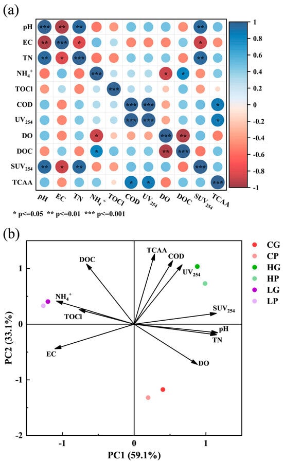 Correlation analysis (a) and principal component analysis (b) of disinfection by-products (DBPs) with water quality parameters. In Figure (a), blue and orange indicate positive and negative correlations between the two factors, respectively. The larger the circle, the stronger the correlation, while the smaller the circle, the weaker the correlation. TOCl is total organic chlorine, TCAA is trichloroacetic acid, and SUV254 is spectral UV absorption at 254 nm. In Figure (b), CG, HG, and LG mean samples in glass bottles from the Yangtze River, Han River, and the Liangzi Lake, respectively, while CP, HP, and LP mean samples in polyethylene bottles from the Yangtze River, Han River, and the Liangzi Lake, respectively. Variables with arrows pointing in the same direction have a positive correlation on principal components, while variables pointing in the opposite direction have a negative correlation. The length of the arrow represents the variance contribution of the variable, and the longer the length, the greater the explanatory power of the variable on the principal component.