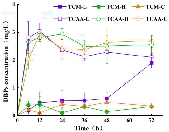 To investigate the variation in the generation of DBPs with reaction time, the Br− concentration in the solution was set at 10 μmol/L and the effective chlorine at 10 mg/L. The solution was then subjected to a dark reaction at 20 °C for 72 h in a constant-temperature incubator. During the reaction, water samples were collected at 6, 12, 24, 36, 48, and 72 h intervals to measure the content of DBPs, as illustrated in Figure 3.