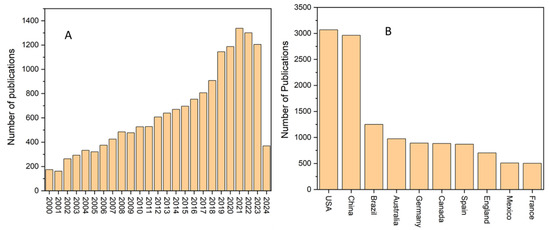Figure 1. The number of research publications (A) and top ten countries (B) globally related to mangrove restoration between 2000 and 2024 (Data source: Web of Science).