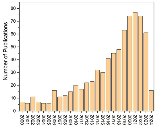 Therefore, we also used the keyword “heavy metals in mangroves” in the Web of Science database. We found that about 740 research articles were published between 2000 and 2024 (Figure 2).