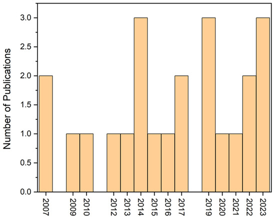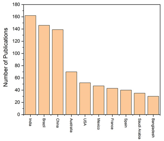 Therefore, Figure 3 indicates the top ten countries that contributed a higher number of mangrove trace metal research articles. Among the countries, India, Brazil, and China contributed a higher number of research articles than other countries (Figure 3). Moreover, we also used the keyword “heavy metals in restored mangroves” in the Web of Science database. We found that 23 research articles have been published between 2007 and 2024, which is significantly lower than the number for mangrove heavy metal research (Figure 2 and Figure 4).