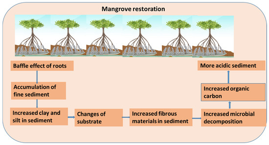 The coastal mangrove ecosystem is considered one of the most carbon-rich forests in the world [16]. It can sequester a high amount of carbon (both in below-ground and aboveground biomass) and is considered a nature-based solution for climate change mitigation and adaptation [16,41]. Several studies have suggested that mangrove restoration has increased organic matter content in the sediment of restoration sites than the surrounding barren areas [19,20,42]. The higher organic carbon content in restoration areas mostly originates from the decomposition of mangrove roots and litter [11]. Mangrove restoration can increase the anaerobic condition in the restoration sediment, which can facilitate the microbial decomposition of mangrove litter (Figure 5) [43]. Therefore, mangrove roots can diffuse oxygen and increase the oxidizing condition, which is important for the sequestration of organic carbon in sediment [19,43].