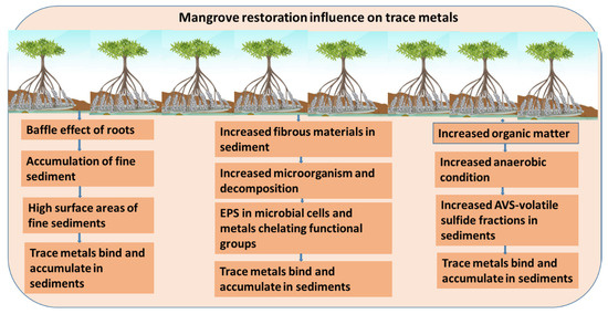 Globally, mangrove restoration or reforestation is increasing due to carbon storage, climate change mitigation, and ecosystem services. It is well established that mangrove restoration can facilitate the accumulation of higher amounts of trace metals in sediments than in surrounding non-mangrove areas’ sediments [19,20,47]. Several studies, such as those conducted in Yifeng Estuary, China; Yundang Lagoon, China; and Jinjiang Estuary, China, indicated that mangrove restoration sites had considerably higher trace metal accumulation than surrounding areas [19,20,48]. In the restoration areas of Yundang Lagoon sediments, the concentrations of Cu, Mn, and Pb were 59.82 µg/g, 996.54 µg/g, and 57.21 µg/g, but in mangrove barren areas, the concentrations were 54.41 µg/g, 584.34 µg/g, and 54.53 µg/g, respectively [20]. A graphical presentation of the influence of mangrove restoration on trace metal accumulation in sediments is displayed in Figure 6.