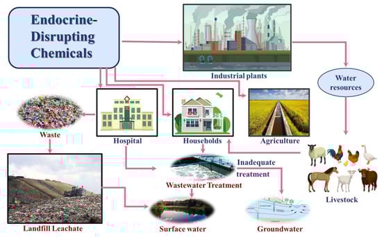 EDCs enter the environment through numerous sources. Some originate from excreta, such as feces and urine, produced after the ingestion of drugs and their metabolites by humans, livestock, or aquatic organisms [25,26]. Others are released from industrial activities, agricultural runoff, sewage irrigation, medical wastewater, and landfill leachate [27,28]. These substances ultimately contaminate surface water and groundwater, posing a significant threat to environmental and public health. Additionally, through multimedia transfer, these contaminants can enter the food web, particularly bioaccumulative compounds, which pose further risks to human health as they accumulate in the tissues of organisms.