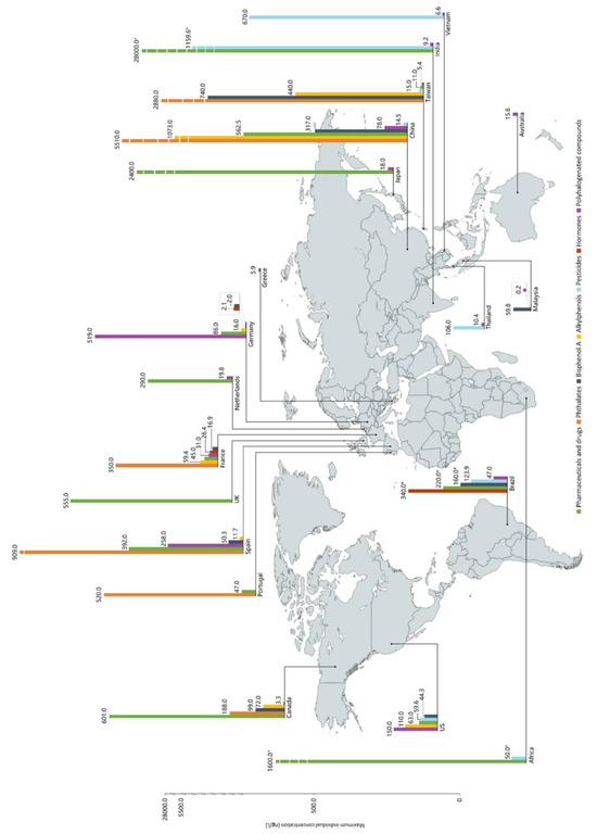 The persistence of EDCs in the environment, particularly in aquatic ecosystems, is alarming because these compounds can exert adverse effects even at very low concentrations, often in the nanogram to microgram per liter range [29]. For instance, Lei et al. [30] examined estrogen levels in rivers within the Beijing–Tianjin–Hebei urban agglomeration in China, finding estrogen concentrations ranging from 23 to 255 ng/L. Similarly, studies on the Tamiraparani River in India revealed triclosan concentrations of 944 ng/L, which is significantly higher than levels found in other water systems [31]. At two monitoring stations in the river, triclosan levels ranged from 3800 to 5160 ng/L, far exceeding the acceptable concentrations. Additionally, EDCs have also been detected in drinking water systems worldwide [32]. Wee et al. compiled studies that show the presence of EDCs in drinking water across various regions globally (Figure 3) [16].