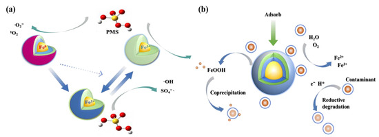 As shown in Figure 4a, Fe0 functions as a heterogeneous catalyst, gradually releasing Fe2+ and controlling the reaction rate to ensure the continuous and efficient degradation of pollutants. Peluffo et al. [70] compared the effectiveness of PS activated by nZVI, Fe2+, and Fe3+ in degrading PAHs in soil. The nZVI/PS system demonstrated excellent degradation performance for phenanthrene (Phe) and benzo(a)pyrene (Pyr). Additionally, nZVI/PS was effective in degrading tetrabromobisphenol A (TBBPA) in soil, achieving up to 78.32% degradation at an nZVI concentration of 3 g/kg. Coexisting ions like Cu(II) enhanced the degradation effect, while Zn(II) inhibited it. Zhang et al. [71] explored the degradation of NOR using the nZVI/PS system under varying conditions of pH, temperature, nZVI dosage, and PS concentration. The optimal removal rate of 93.8% was achieved with 0.1 g/L nZVI and 12 mM PS, with hydroxyl radicals playing a dominant role. nZVI can effectively degrade not only synthetic compounds but also natural hormones, which are frequently detected in wastewater and surface water, posing potential threats to ecosystems and human health. Due to its strong reducing and adsorptive properties, nZVI can disrupt the chemical structure of natural hormones, significantly reducing their bioactivity. Ding et al. [72] used nZVI to activate peroxynitrite for the removal of E2, demonstrating that Fe⁰ and Fe2⁺ were the primary catalytic activators. PS is activated by electrons produced from the redox reactions between Fe2+ and Fe3+, generating free radicals. In conclusion, nZVI has emerged as a highly favored technology for environmental remediation in recent years, owing to its low cost, large specific surface area, sustained supply of Fe2+ for direct or indirect reactions with PS to degrade target pollutants, and the stability of the activated persulfate [73].
